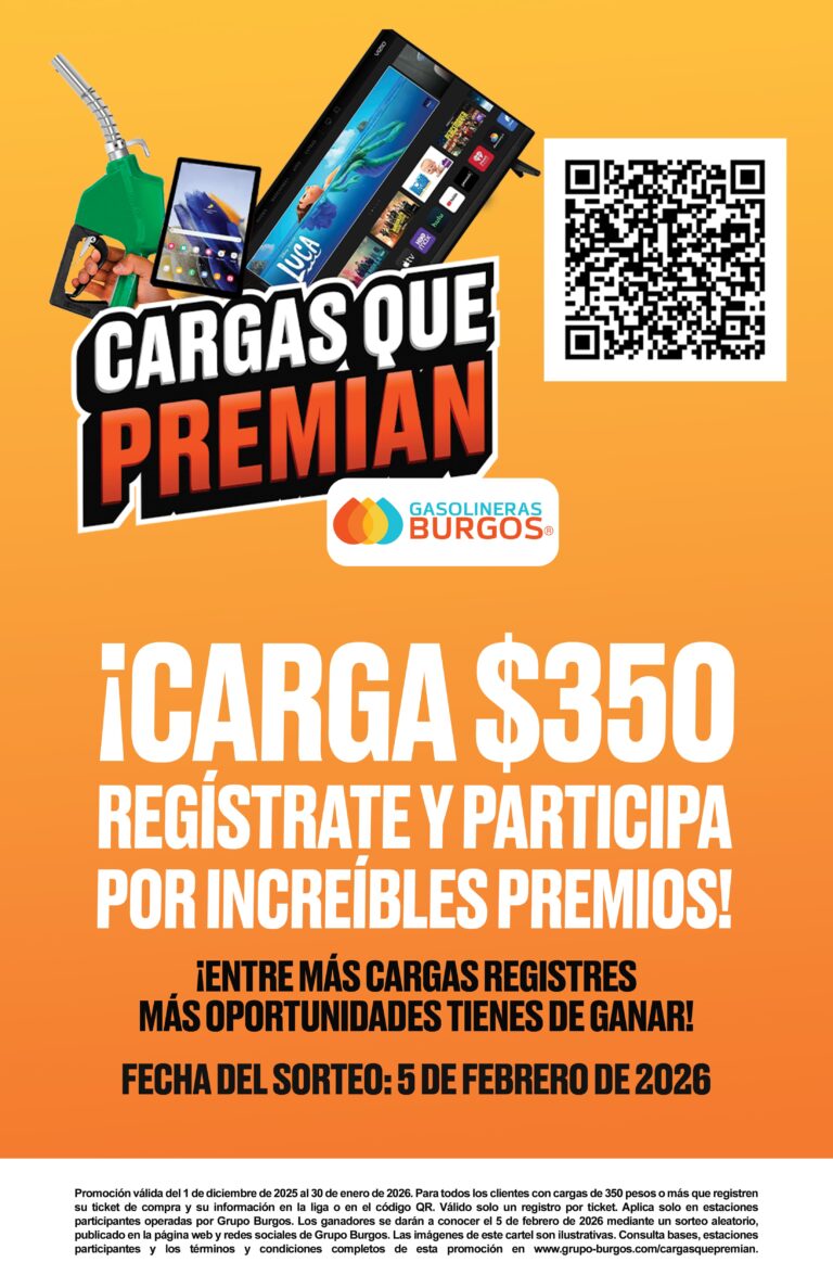válida del 01 de diciembre 2025 al 30 de enero de 2026, en estaciones de Grupo burgos en la ciudad de Reynosa, Tamaulipas. Aplica para clientes con cargas de gasolina Magna, Premium de $350.00 pesos o más, que se registren y envía la foto de su ticket mediante el enlace que se encuentra escaneando el qr en la publicidad. Al registrarse podrá participar para ganar uno de los premios mediante un sorteo aleatorio. No aplica con otras promociones. Métodos de pago participantes son: efectivo, tarjetas bancarias débito o crédito. No participa ningún método de pago no mencionado (no participan pagos con vales de papel o digitales). Imágenes ilustrativas. Consulta los términos y condiciones completos en: https://grupo-burgos.com/cargasquepremian
